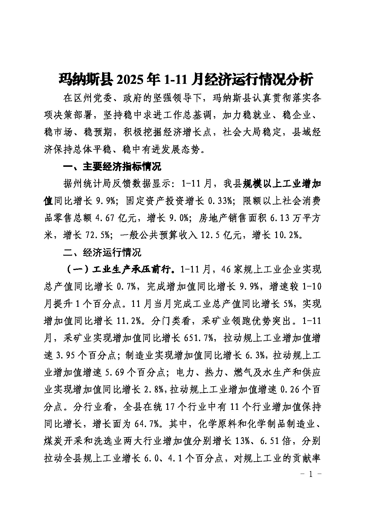 玛纳斯县2025年1-11月经济运行情况分析