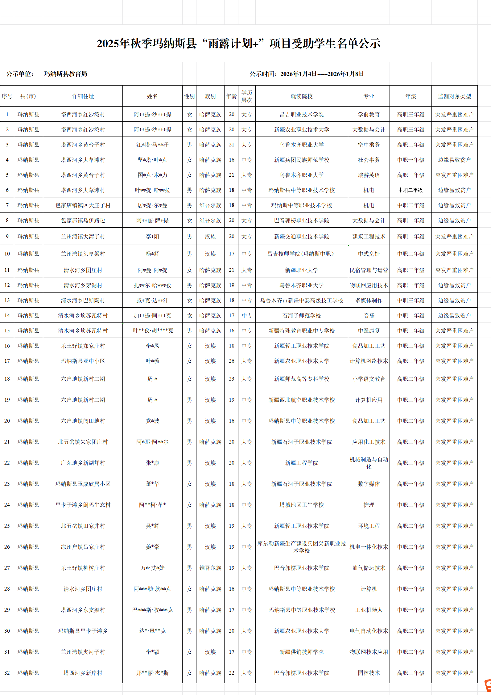 玛纳斯县农业农村局推送32名在职业院校就读的监测户家庭学生,经逐一核实确认,符合“雨露计划+”项目补助条件,可以享受2025年秋季学期补助1500元/人,现进行公示,接受社会监督。公示期为2026年1月4日至2026年1月8日。
