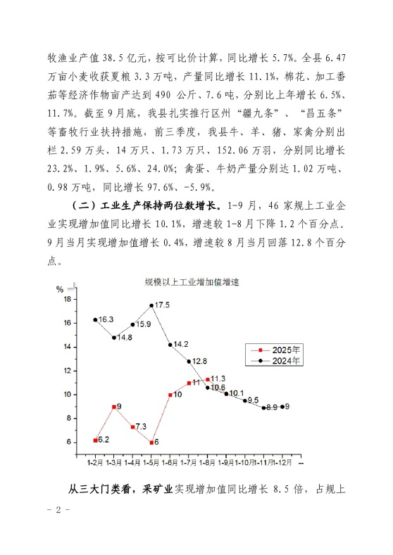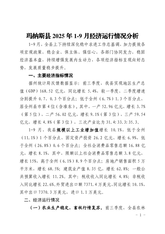 玛纳斯县2025年1-9月经济运行情况分析