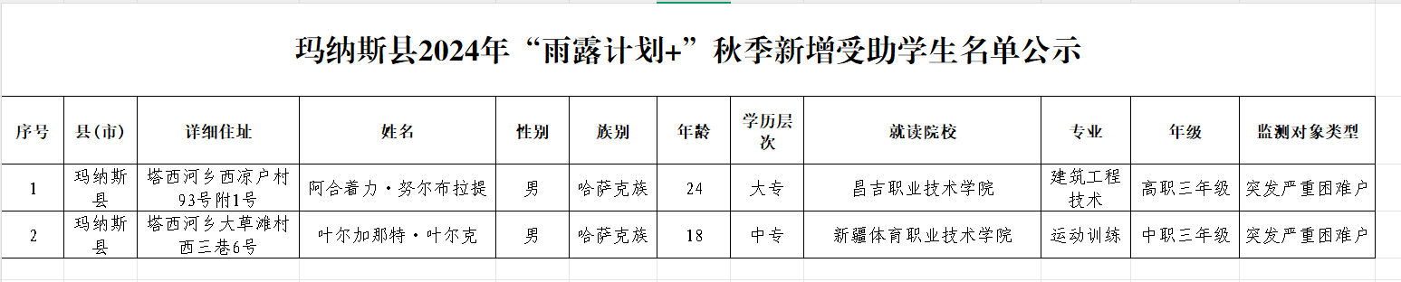 依据玛纳斯县乡村振兴局推送的《2024年玛纳斯县“雨露计划+”秋季新增受助学生名单》,教育局逐一核实,均符合受助条件,现进行公示,公示期:2025年1月7日-1月11日。