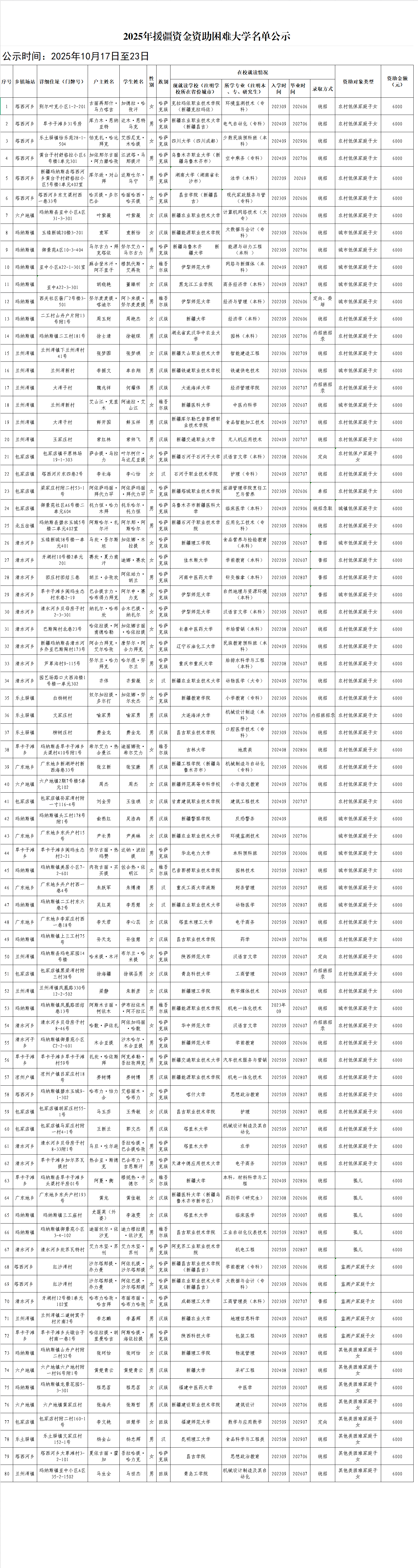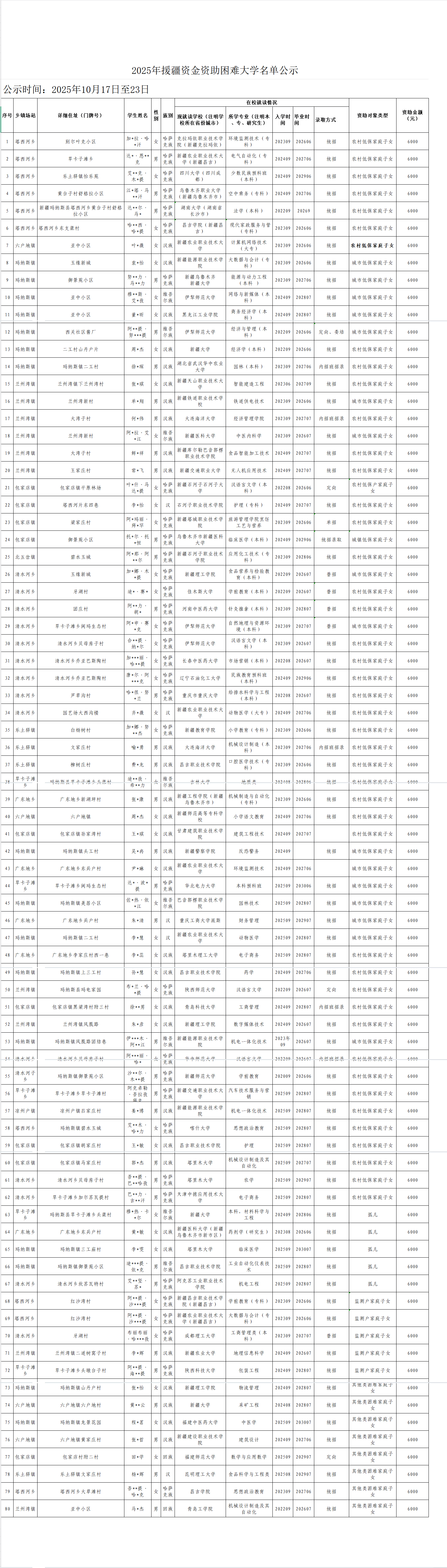 【资助信息】2025年援疆资金资助困难大学名单公示